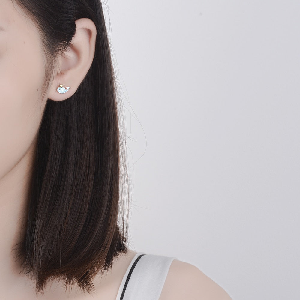 Whale Lover Petite Blue and Gold Whale Earrings Minimalist Jewelry. Save the Whales Jewelry