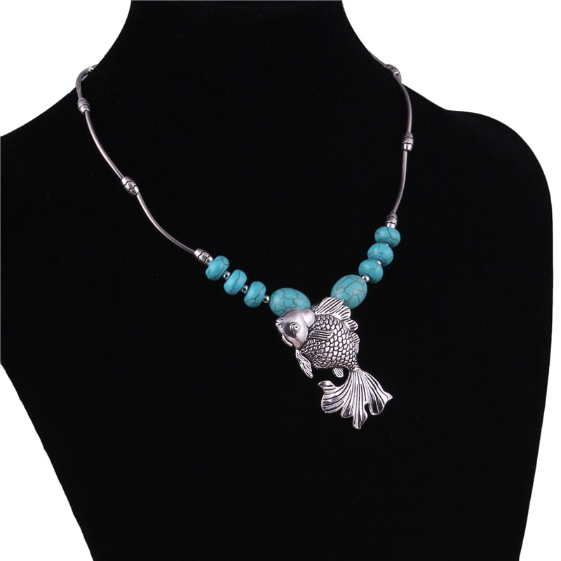Save Ocean Animals Jewelry Necklace | Vintage Boho Tibet Silver Color Natural Stone Fish Necklace,