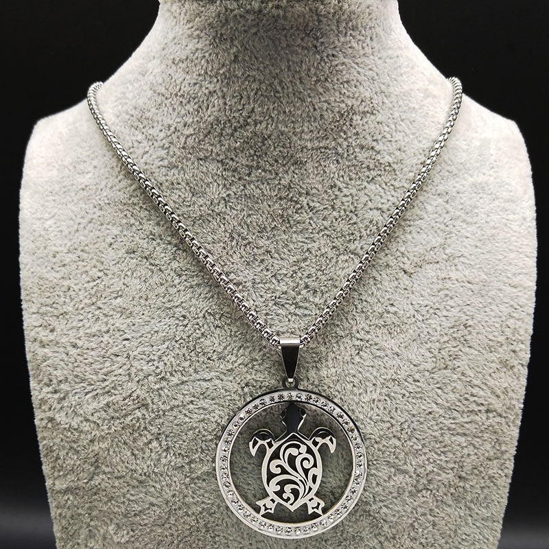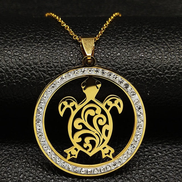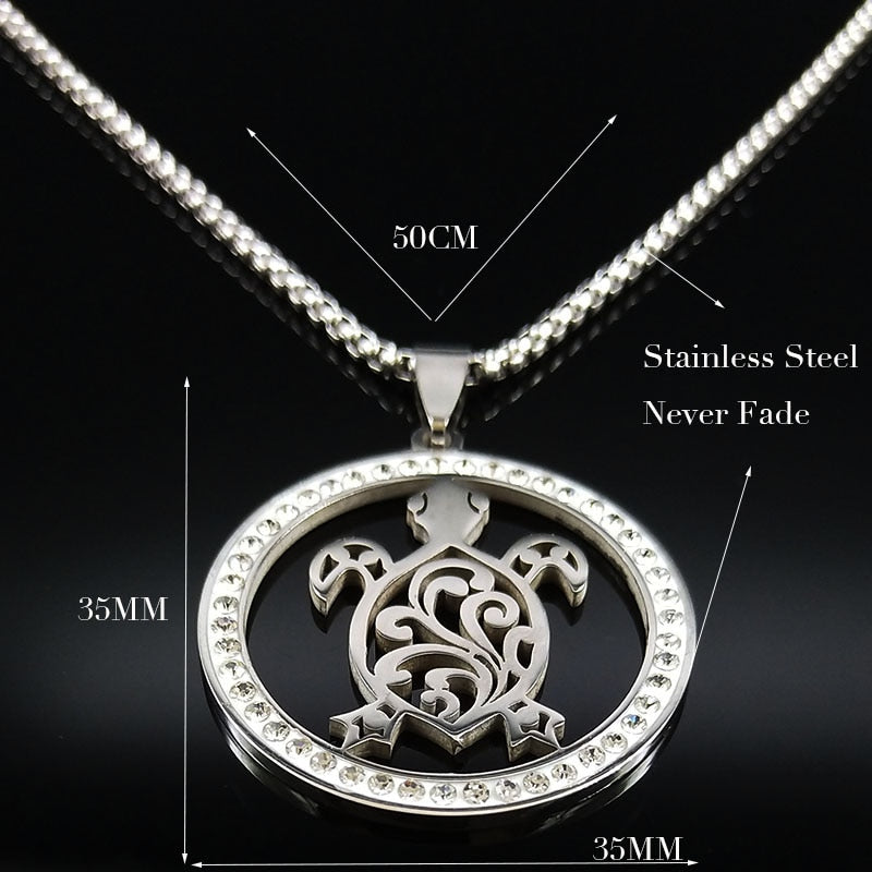 Tribal Sea Turtle Necklace Crystal Stainless Steel Chain Silver/ Gold Color, Save Sea Turtle Jewelry
