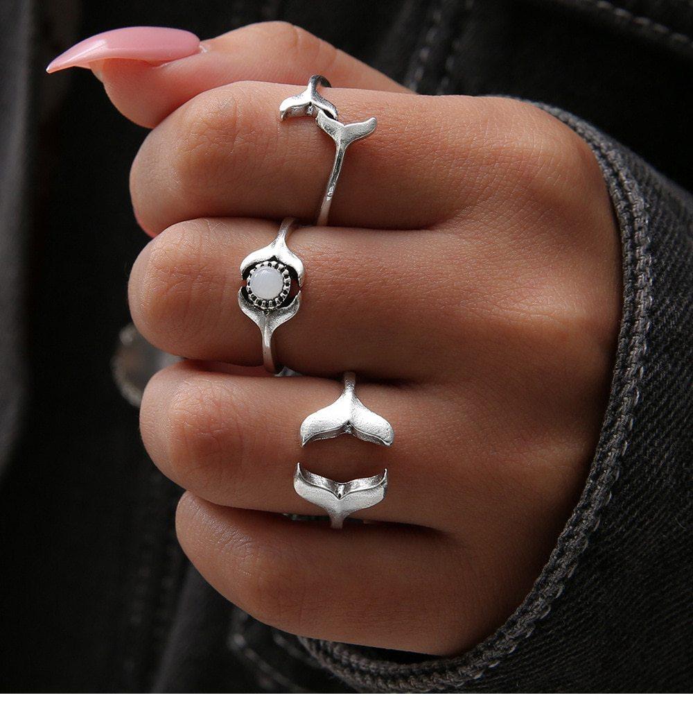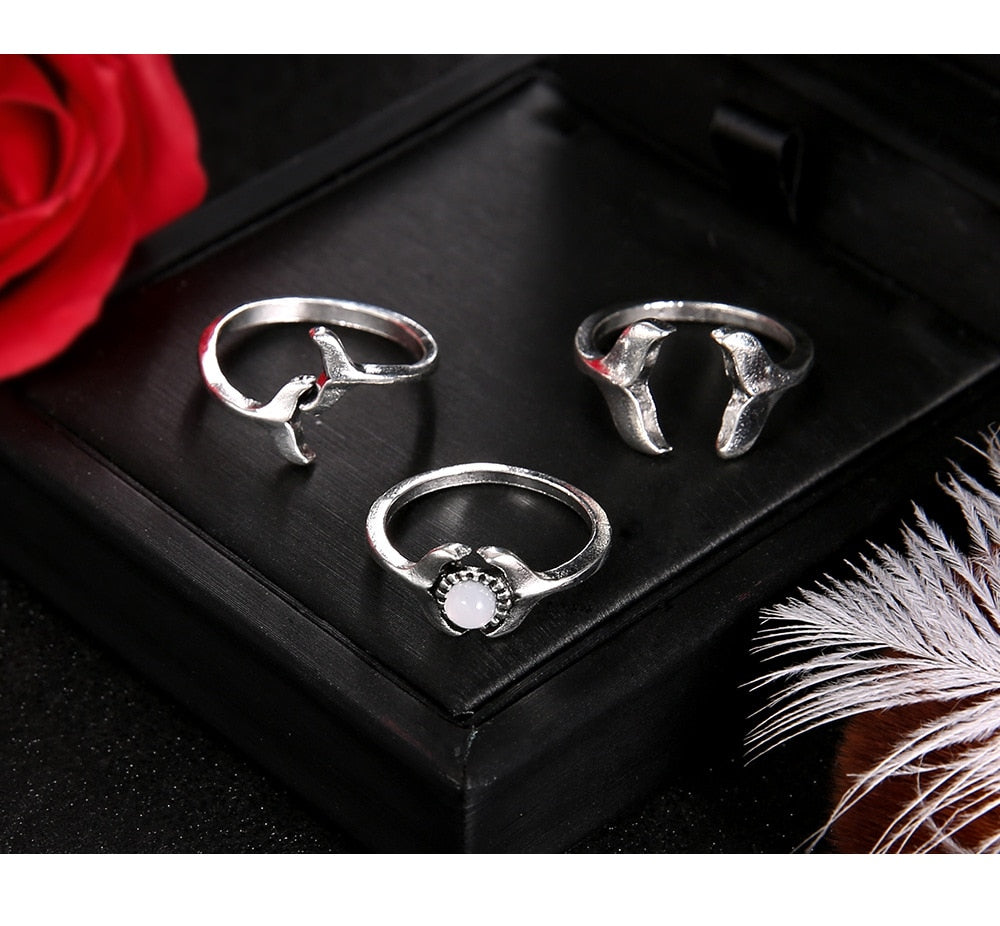 Save the Ocean Ring, Silver Color Opal Knuckle Whale Tail 3 Piece Rings Set, Save the Whales Jewelry